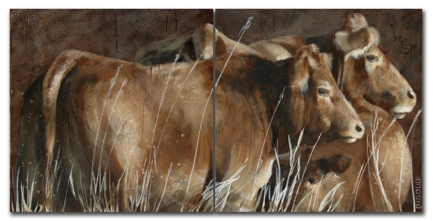 Two cows and a calf behind high grass (2009)